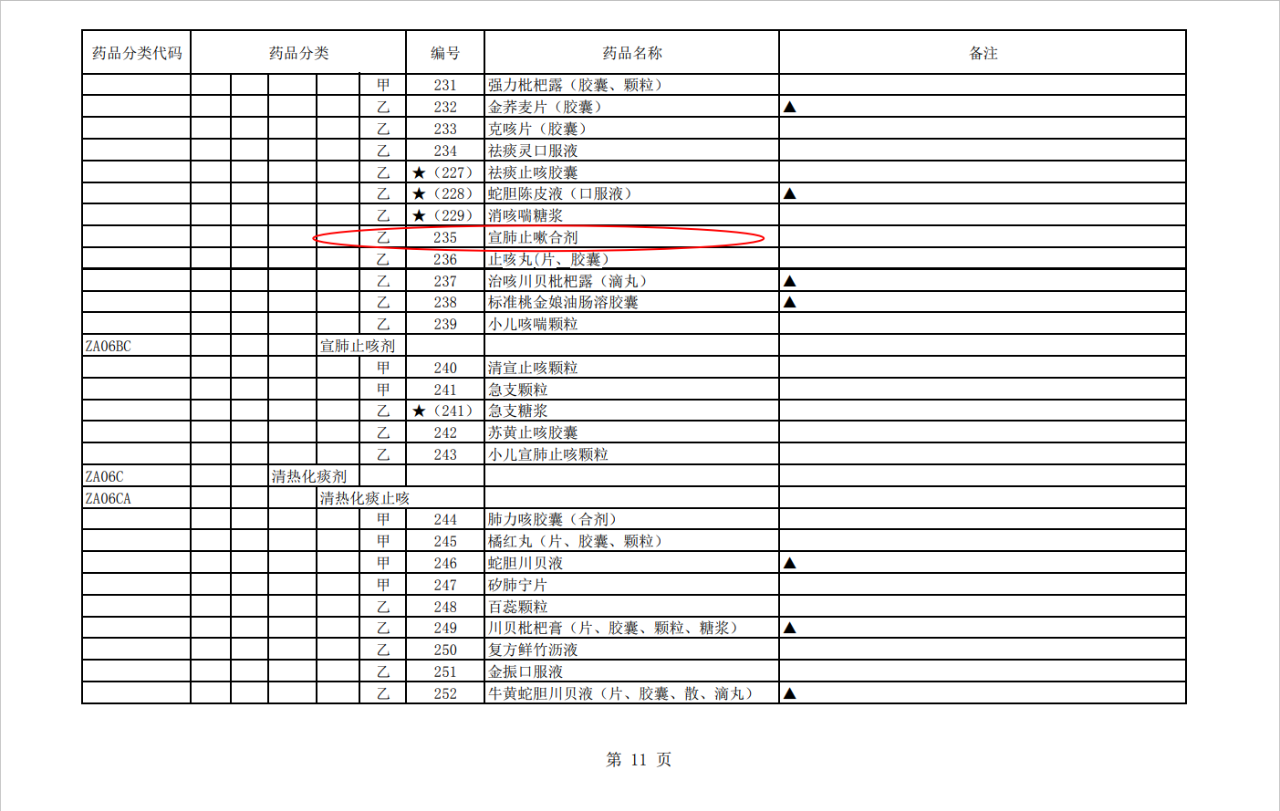 甘肅普安制藥股份有限公司主打產(chǎn)品宣肺止嗽合劑被納入中成藥部分,藥品分類代碼:ZA06BB,藥品分類:祛痰止咳劑乙類,編號:235號。