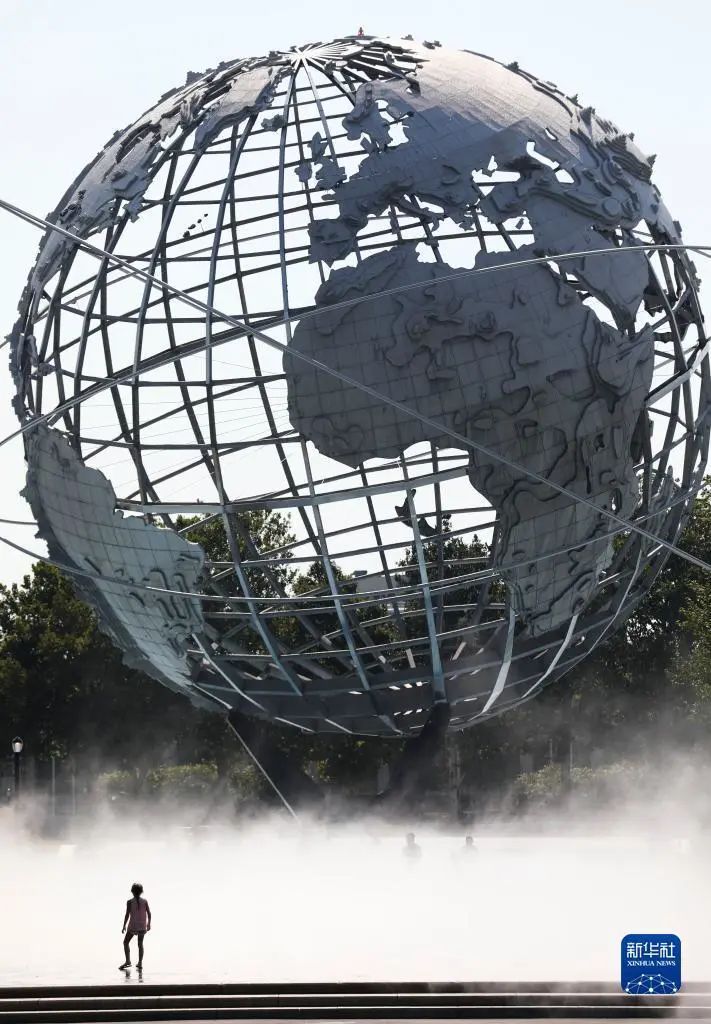 2021年8月13日,一名兒童冒著高溫天氣站在美國紐約科羅納公園水霧廣場的地球模型前。新華社記者 王迎 攝