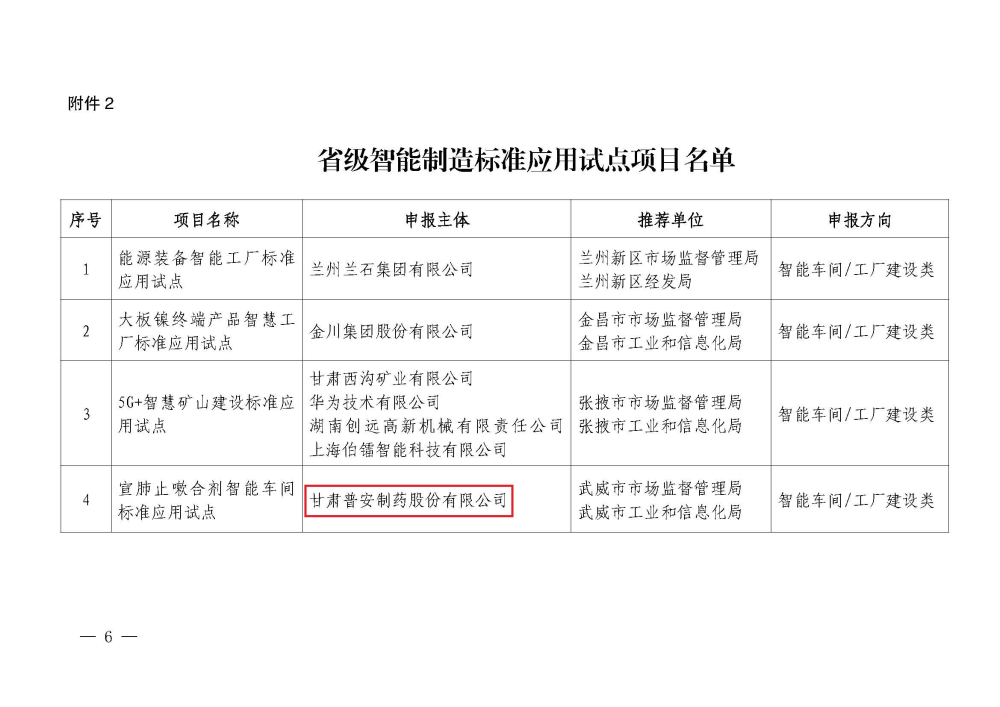 甘肅藥業集團普安制藥《宣肺止嗽合劑智能車間標準應用試點》順利通過省市場監督管理局和省工業和信息化廳嚴格審核,成功入圍省級智能制造標準應用試點項目名單。此次獲批的項目是武威市唯一一個省級智能制造標準應用試點項目,也是公司貫徹“抓執行促落實、抓效能促發展”的又一新突破點,從而實現了甘肅藥業集團普安制藥2023年度標準化工作的開門紅。
