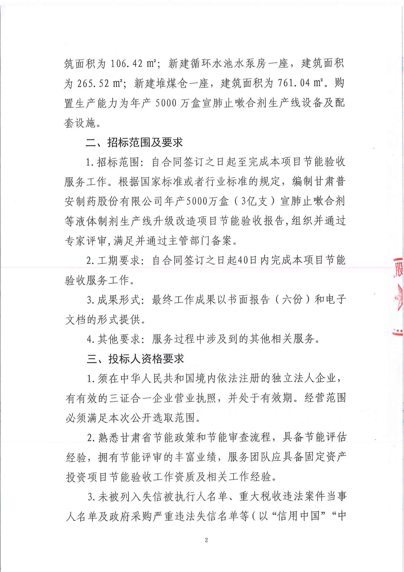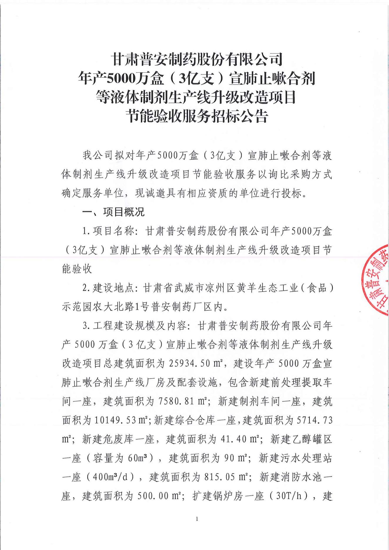 甘肅普安制藥股份有限公司年產5000萬盒(3億支)宣肺止嗽合劑等液體制劑生產線升級改造項目節能驗收服務招標公告