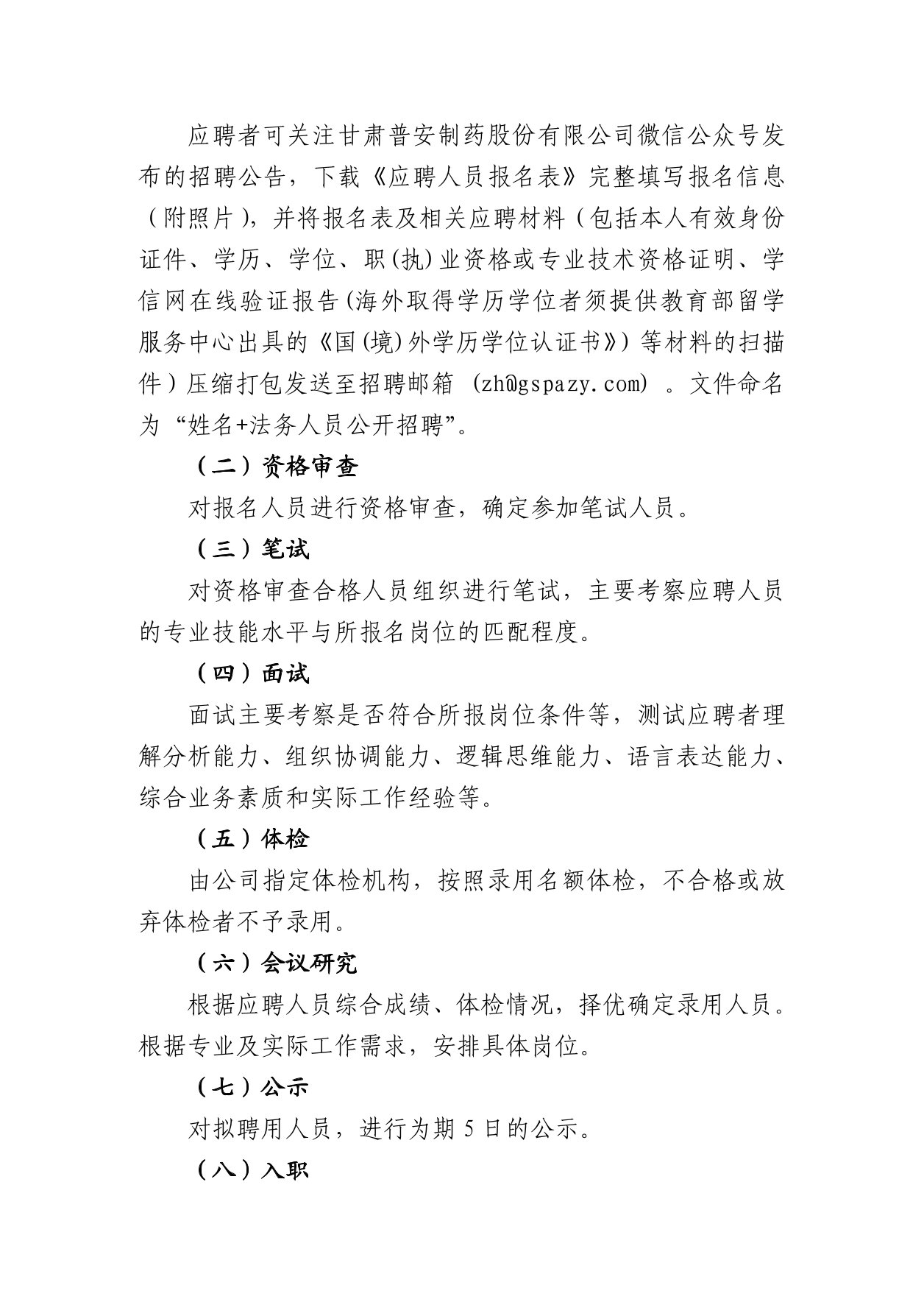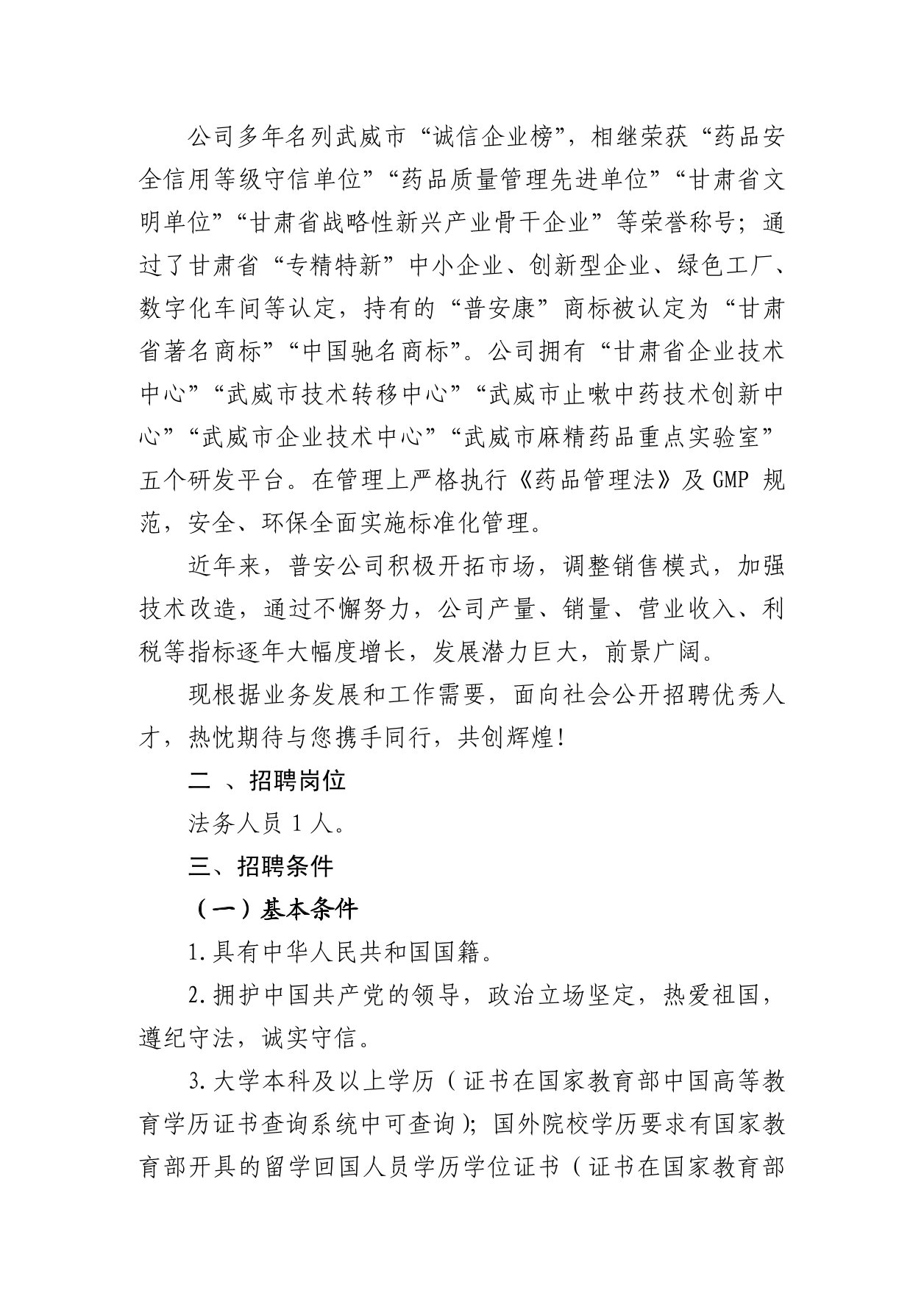 甘肅普安制藥股份有限公司 關(guān)于公開(kāi)招聘法務(wù)人員的公告